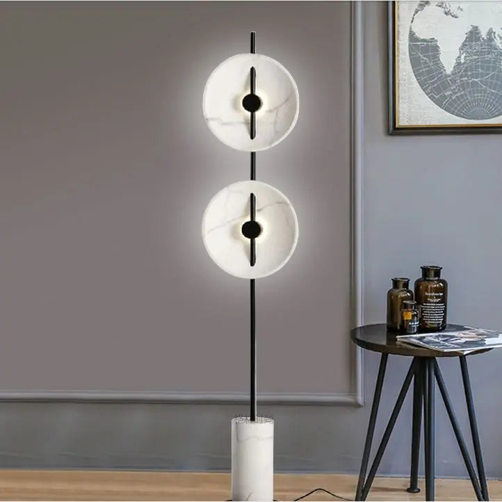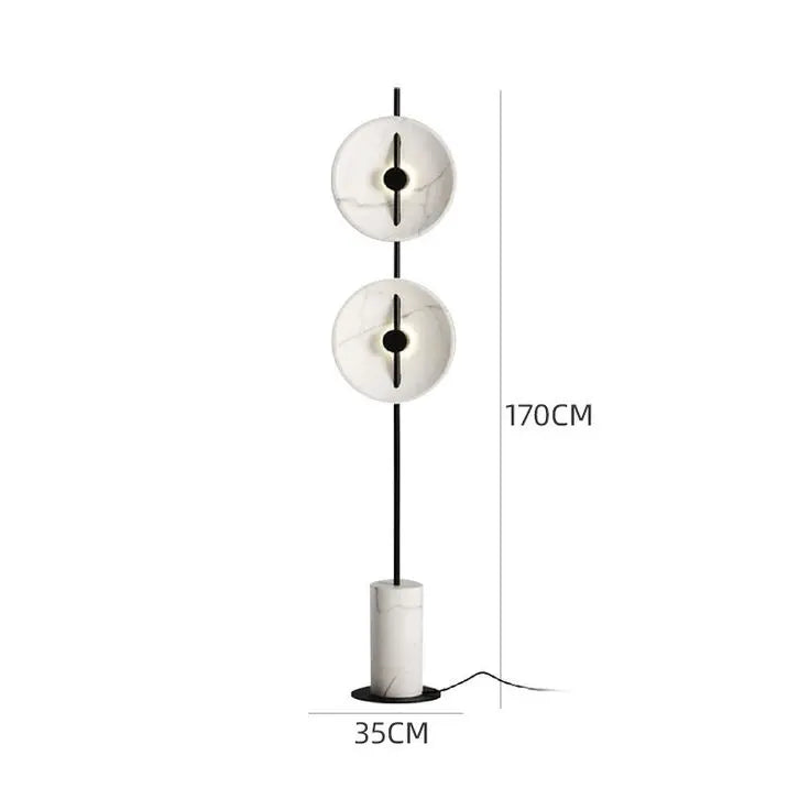 Mitra Floor Lamp features a striking vertical composition with 2 marble-effect discs attached to a slim black metal stem standing on a marble base.  Emitting a soft, warm, indirect light through 2 meticulously crafted discs, the lamp gives a minimalist and artisanal elegance to your space, definitely a statement piece in any room.